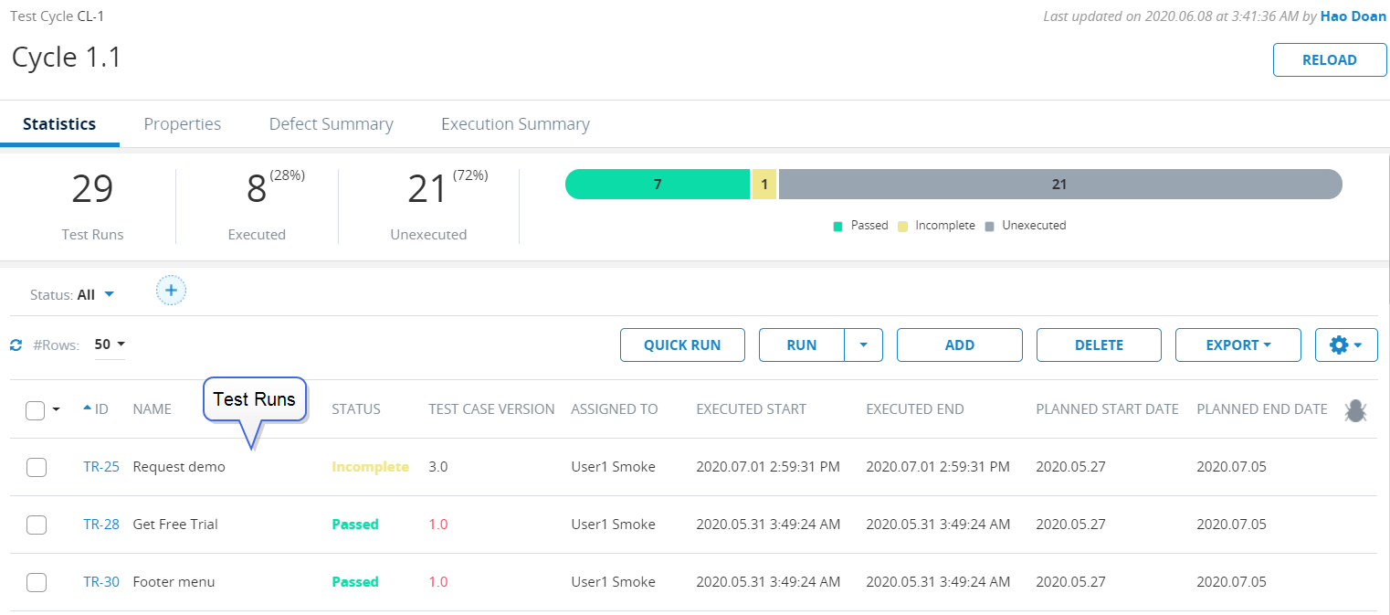 Test Runs. Test Runs are single instances of executed Test Cases. Test Runs are located in the Test Run grid on a Release, Test Cycle, or Test Suite screen.
