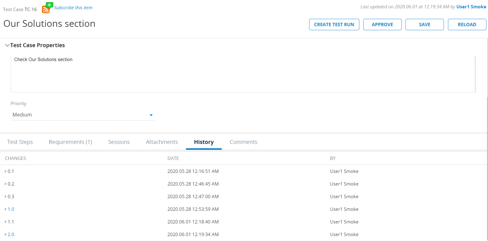 When editing the Test Case, you can only make changes based on the latest version of the Test Case, not previous versions. Changes made over time, can be viewed on the History tab of the Test Case, as displayed below.