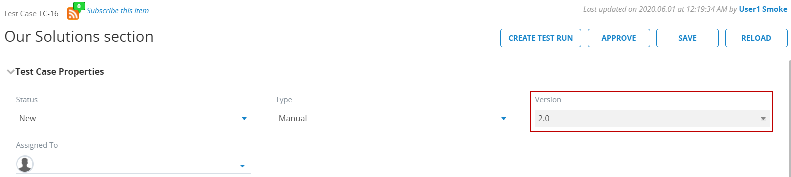 When you save a Test Case with new changes, the Test Case's version will automatically increase by 0.1. The version number is visible as a system field on the Test Case page, as shown below.