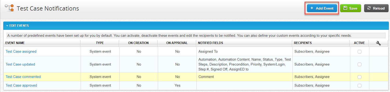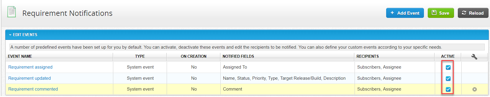The Requirement Notifications page is displayed. Deselect the check boxes in the Active column for each event.