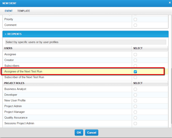 In the Recipients section, specify who you want to receive this email notification. In this example, you would click the check box for Assignee of the Next Test Run to select the tester assigned to the next test within the test suite.
