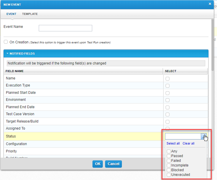 In the Notified Fields section of the dialog, select the drop-down menu in the Status field.
