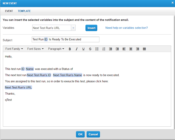 Notification settings allow users to manage how qTest sends emails to one or more recipients when a change is made to the system. For example, you can set up qTest Manager to send an email notification to a manager when a Test Case status changes. The type of email notification you set up depends on the object you select (i.e., Requirements, Test Runs, Test Cases, etc.).