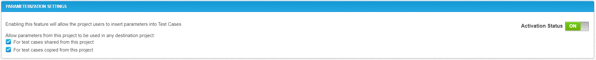 Parameters are enabled for every project by default. If you disable these options, you will need to manually correct your parameters in qTest Parameters. In the Parameterization Settings section, you can change the feature's activation status and select whether Parameters from the current Project can be used in Test Cases shared to the Project or Test Cases copied to the Project.