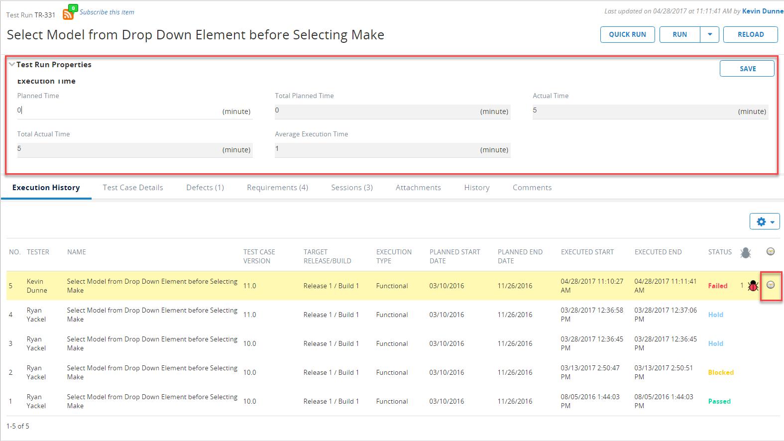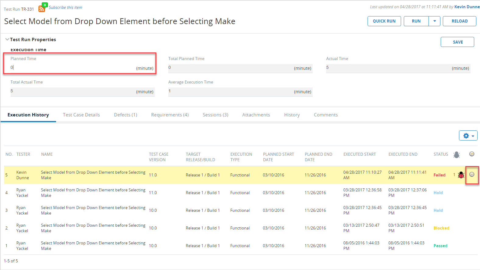 The Planned Time and Actual Time tracked on the latest Test Log are shown in the Test Run.