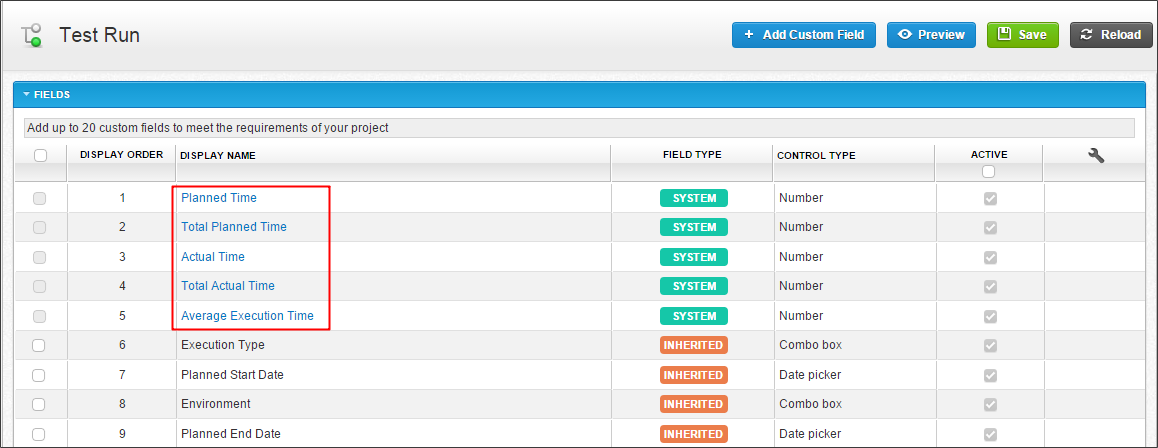 When Time Tracking is activated, the following fields are visible in Test Run's Field Settings of the project: