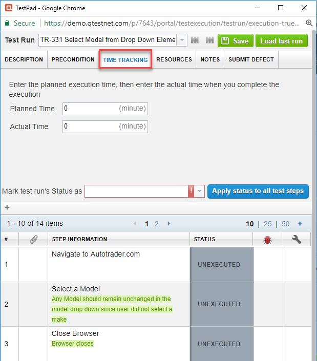 Select the Time Tracking tab. The Planned Time you have input into the Test Run is populated. You can change the value if you wish.