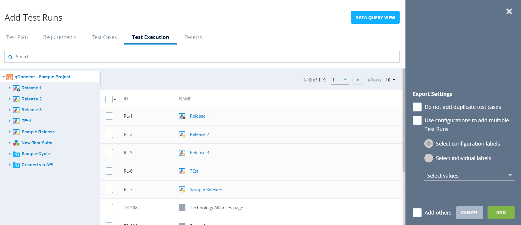 You can also select an entire Test Suite, Test Cycle, or Release to add Test Runs in bulk.
