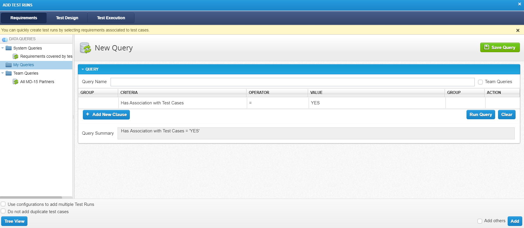 | Test Execution | Run queries for Test Runs, such as queries displaying unassigned Test Runs or Test Runs that are not associated with Requirements. |