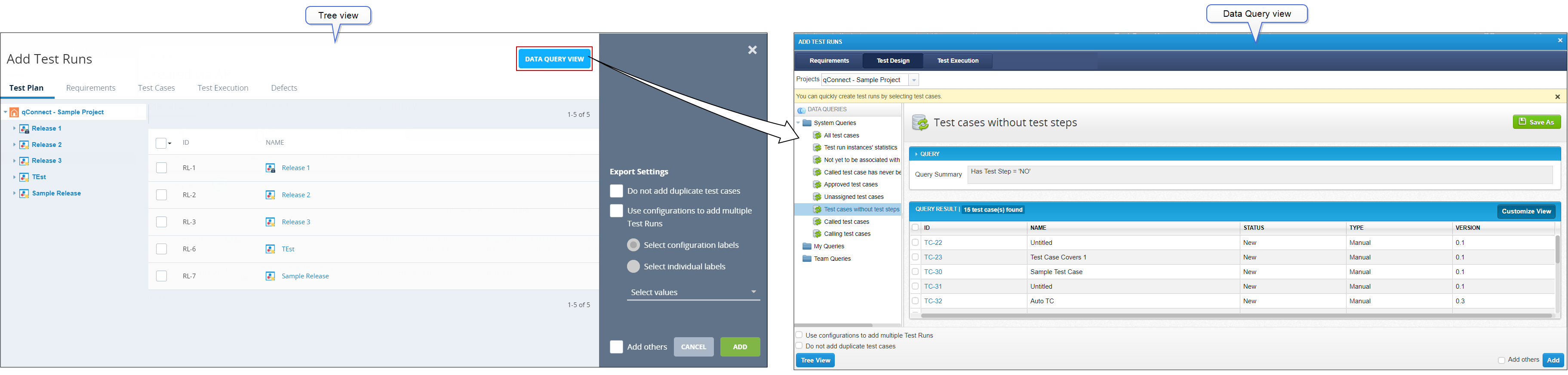 Various export settings are available on the Add Test Runs dialog in both Tree view and Data Query view. These settings include options for adding Test Runs, such as whether to exclude duplicate Test Cases and whether to keep the Add Test Run dialog open after adding Test Runs.