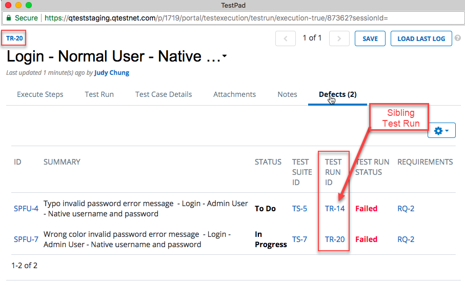 The Defects tab displays all Defects linked to previous Test Logs or Test Logs of "sibling" Test Runs. Sibling Test Runs are the other Test Runs in the same Test Case.