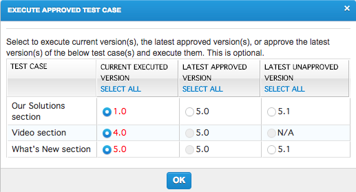 On the Execute Approved Test Case modal, select the option button for the most recent version of each Test Case listed.