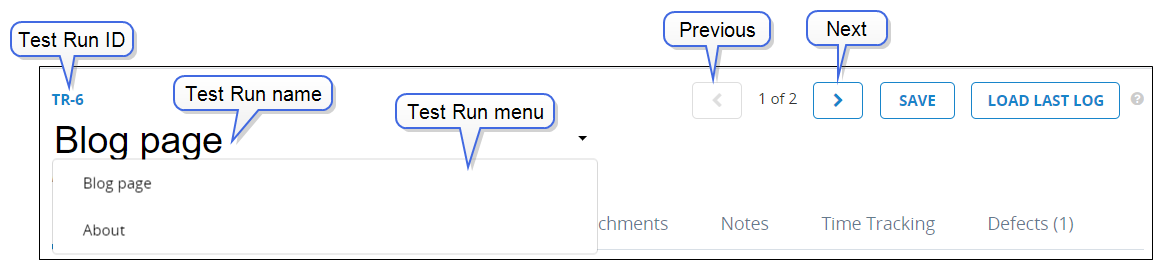 | Test Run menu | Click the arrow to the right of the Test Run name to display a drop-down list of the Test Runs that you selected on the test object screen, if you selected multiple Test Runs. Select a Test Run in the list to display the Test Run on the TestPad. |