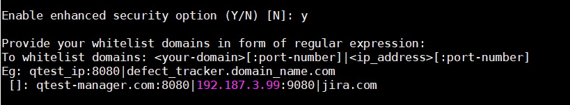 After configuring the basic ports and the URL address for qTest Manager, you can enable enhanced security features. To do so, select Y and whitelist your domains as required.