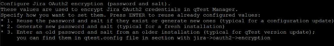 3. Enter values from an older installation: Select this option to enter values from an earlier installation, to allow qTest to read previously encrypted OAuth2 data. You may need to do this when you upgrade from a previous qTest version. You can find these values in the qtest.config file under jira > oauth2 > encryption.