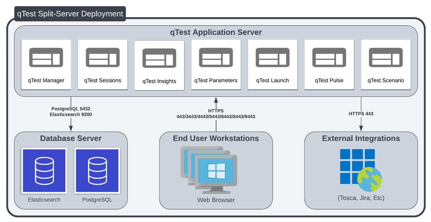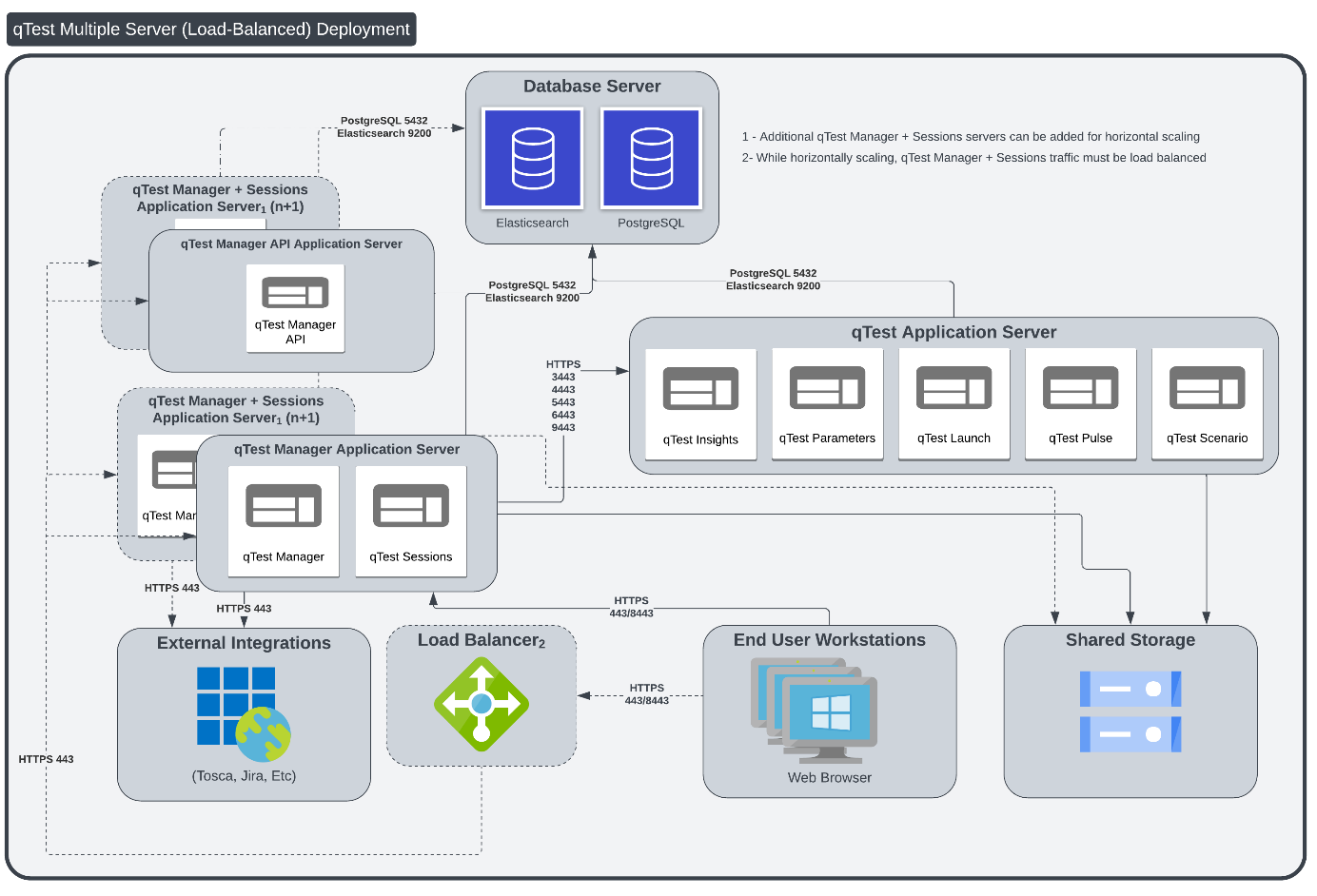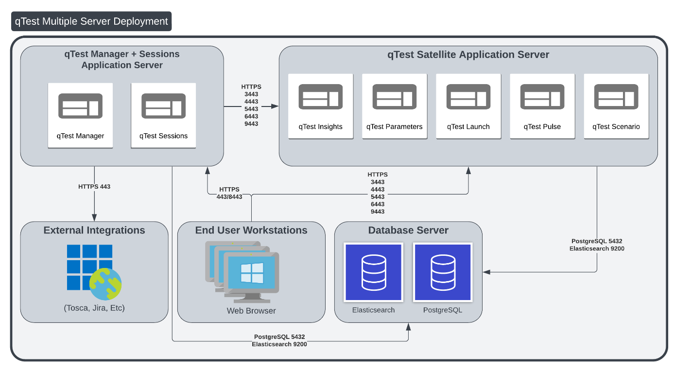 qTest components and prerequisites applications communicate with each other via TCP and HTTPS. As long as they can connect via specific ports, you can install them on different systems. Use a distributed file system like NFS or SMB to support files that may need to be shared among services. In qTest SaaS, each application has a dedicated server to ensure the best control, but that may not be necessary for an OnPremises deployment.