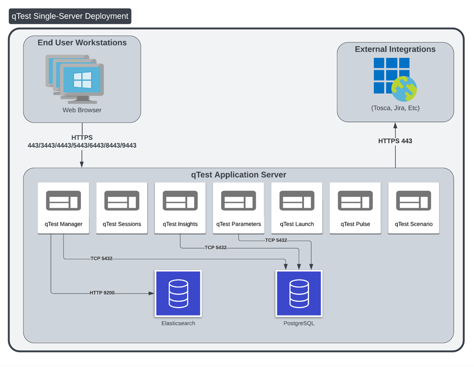 The single server option requires one server that has all qTest applications, PostgreSQL, and Elasticsearch installed.
