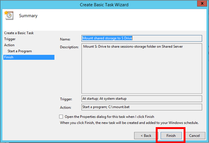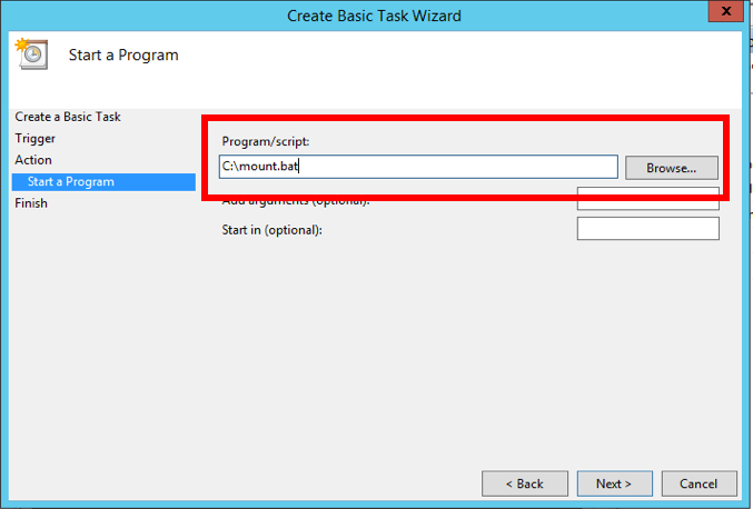 On the Start a Program screen, enter C:\mount.bat in the Program/script field, and then click Next.