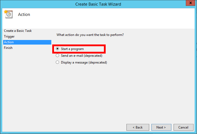 On the Action screen, select the option Start a program, and then click Next.