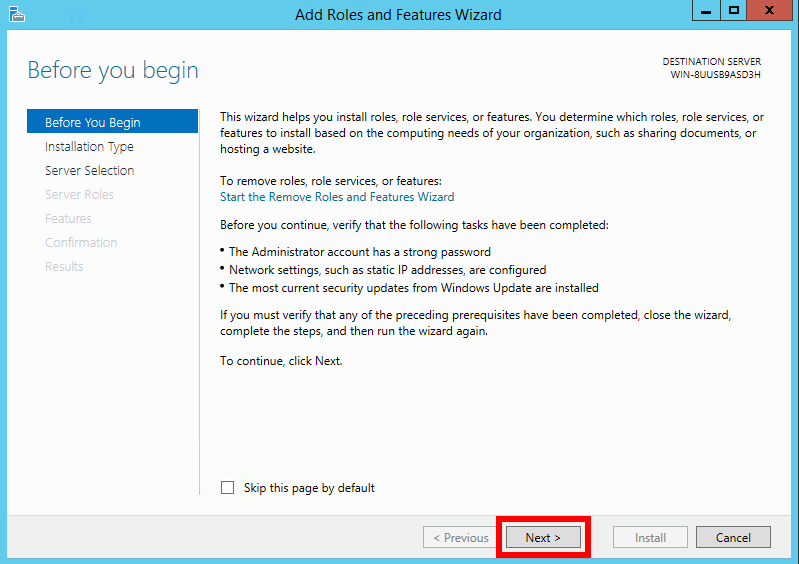 On the Select installation type screen, make sure the option Role-based or feature-based installation is selected, then click Next.