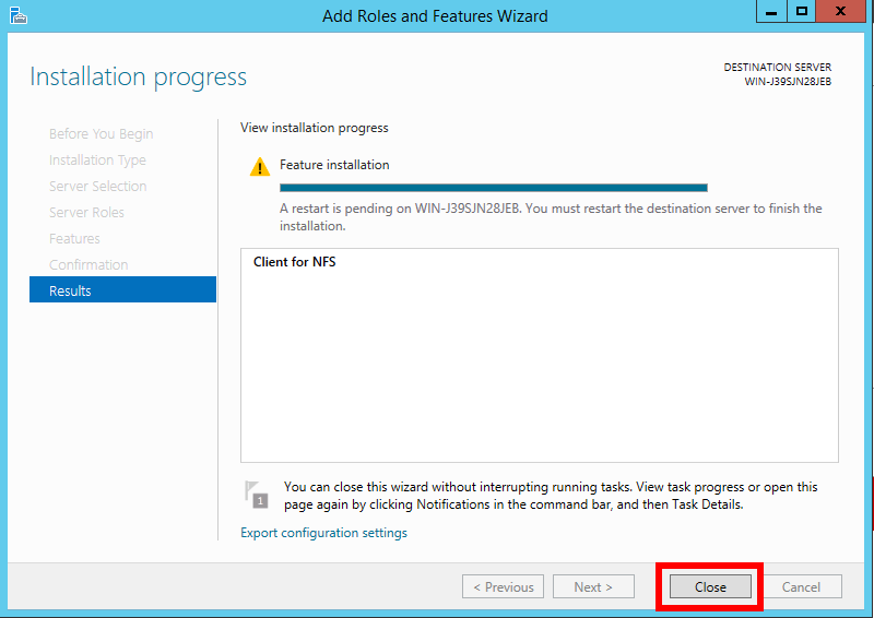 On the Installation progress screen, wait for the installation to complete, and click Close.
