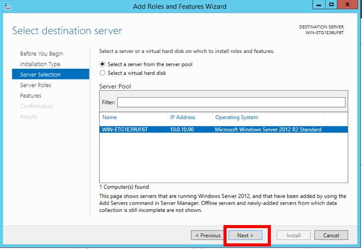 On the Select destination server screen, make sure the option Select server from the server pool is selected, and click Next.