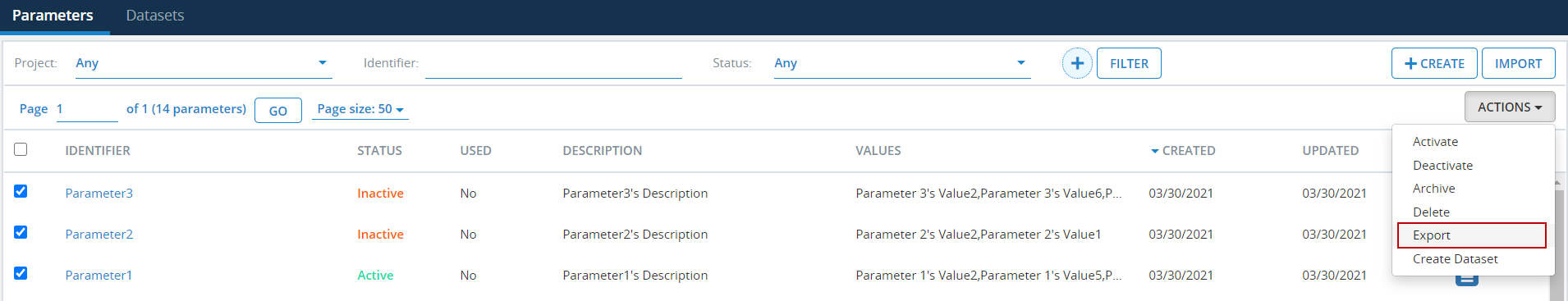 Up to 100 Parameters can be exported at a time. Archived Parameters cannot be exported.