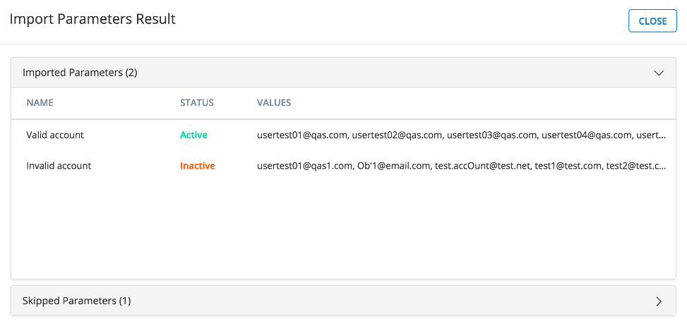 Once the file is imported, the Import Parameters Result dialog appears. This dialog lists details for the Parameters that were imported, the Parameters that failed to import, and the Parameters that were skipped, if applicable.