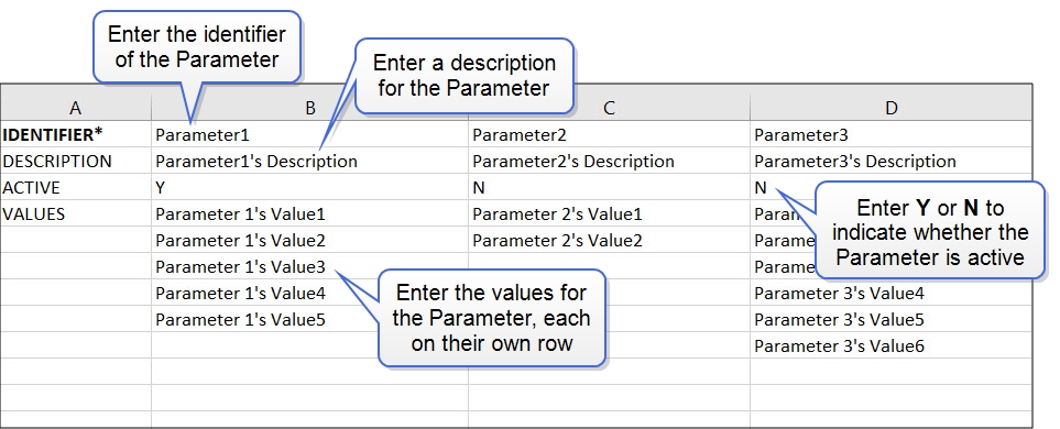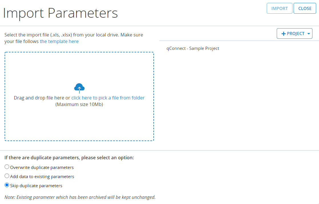 Before importing Parameters, verify that your .xls or .xlsx file follows the format provided in the template. To access the template, click the the template here link on the Import Parameters dialog.