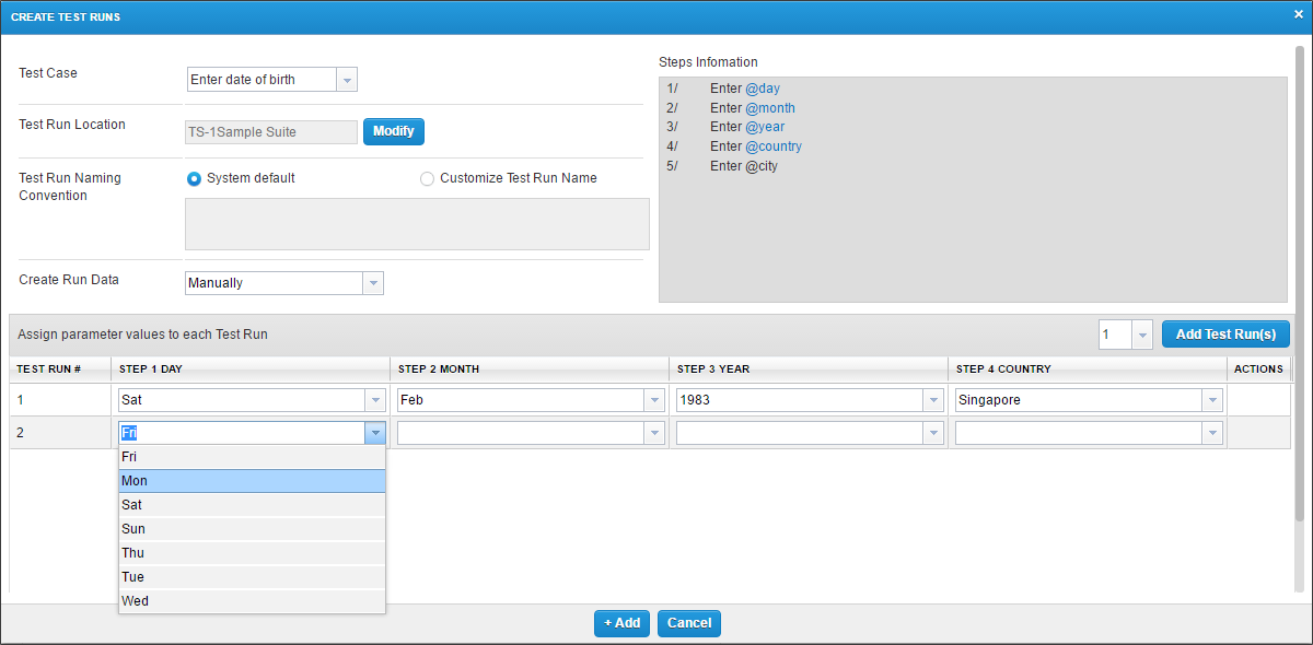 ManuallyIf you know the specific data you want for each Test Run, you can manually add individual values to each Test Run.