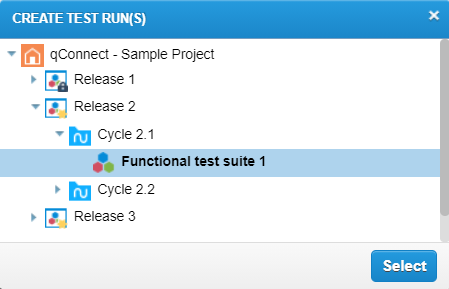 On the Create Test Runs modal, select the Release, Test Cycle, or Test Suite that the new Test Runs should be added to. Then click Select.