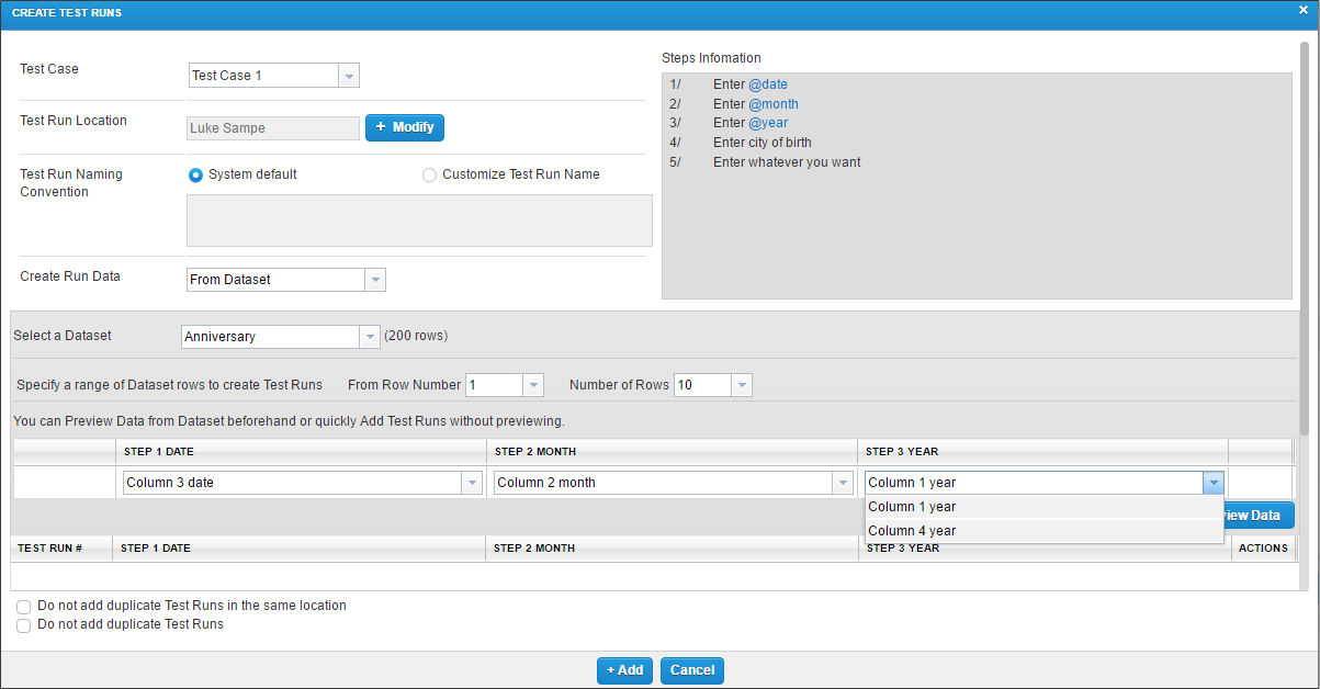 In the Add Test Runs field, select the number of Test Runs that you want to add, and then click the Add Test Run(s) button to add the Test Run rows to the grid.