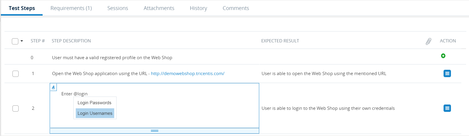 In the Test Step that you want to call the Parameter in, click the Step Description field or the Expected Result field to edit the text of the step description or the expected result, respectively.