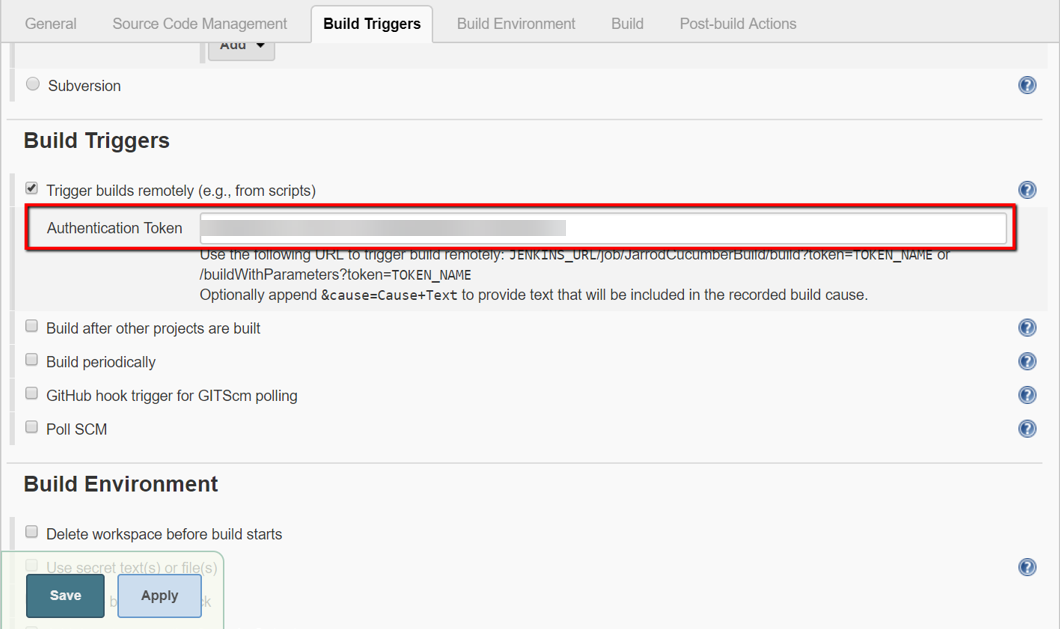 In the Value field, paste the unique Authentication Token generated in the 'Build Triggers' setting of your Job.