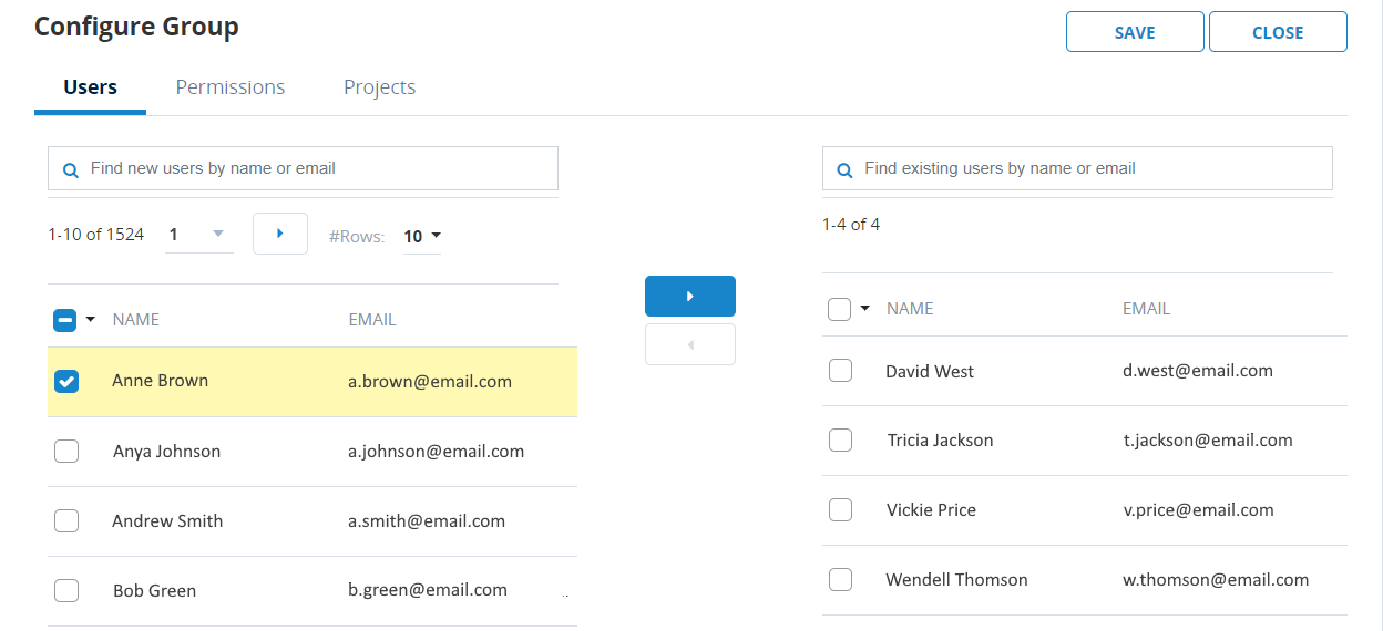 Select the check box next to the user's name, and then click the right arrow to move the user to the list of existing users in the User Group.