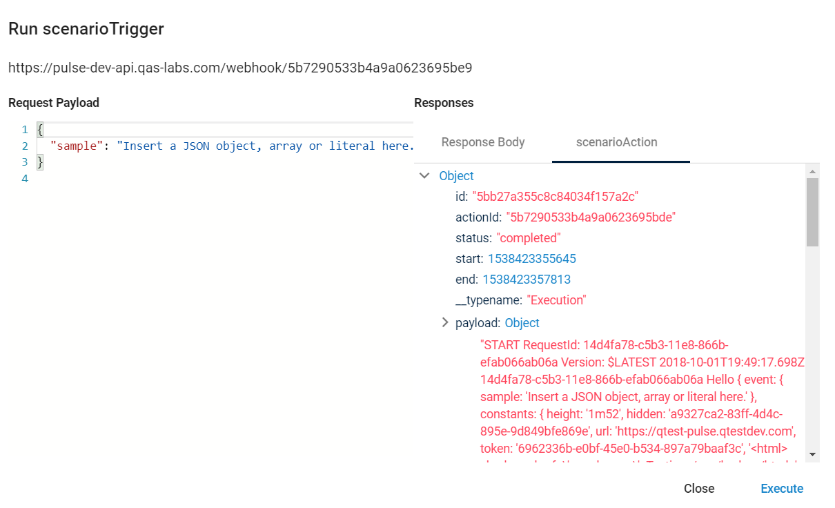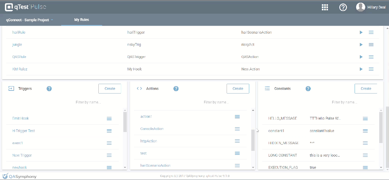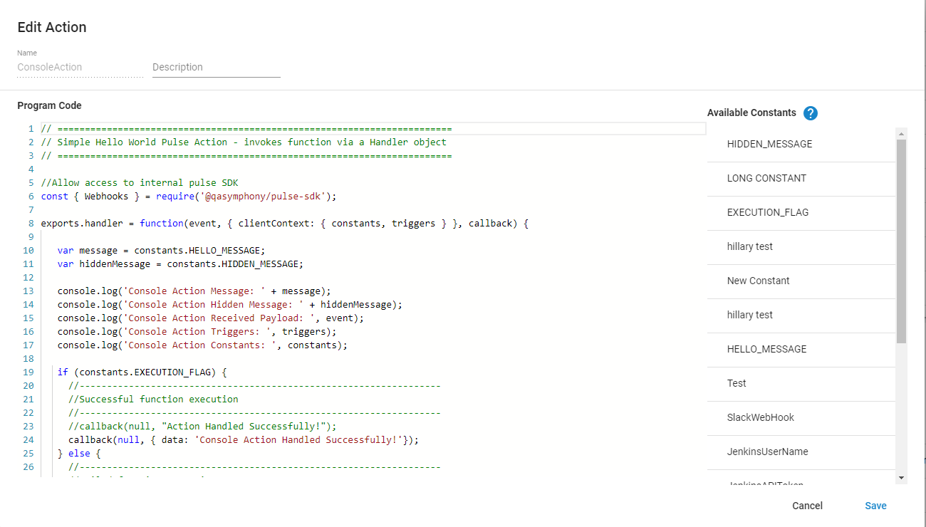 An Action is the program code that you want to execute as part of a Rule. Example: If you want to pass a payload to an action, you can send a message to any other tool with an available Due to the open-ended nature of qTest Pulse's design using JavaScript.