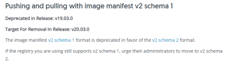 - Docker will not allow user to use Docker images that built with v2 schema 1 from Docker v20.03.0.