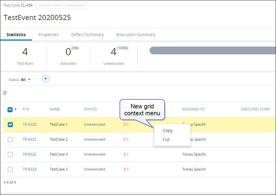 Test Execution tree functions added to object grid context menus