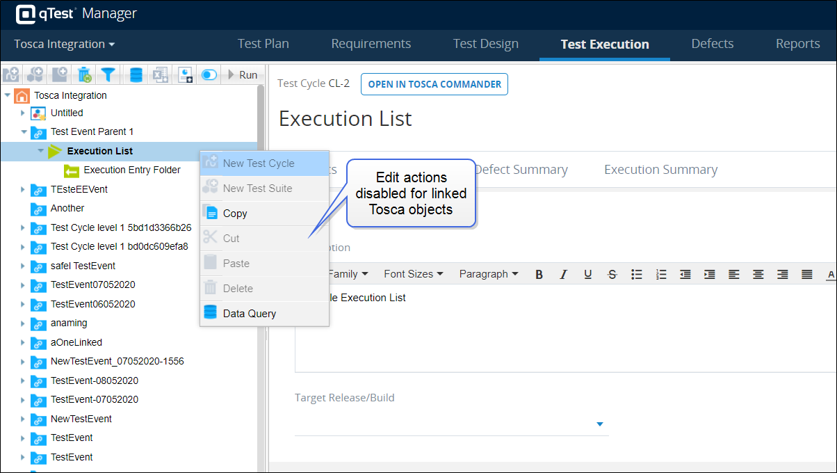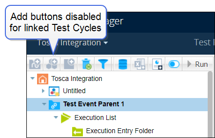 In addition, new items, including Test Suites and Test Runs, can no longer be added to linked Test Cycles. All related buttons, such as the Add Test Runs button on the Test Execution tree panel and the Add button on the Execution grid, are now disabled for Test Cycles that are linked to Tosca.