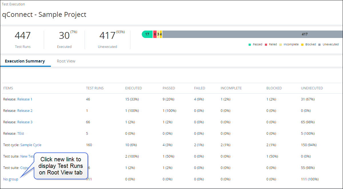 In addition, a new No Group link now displays on the Execution Summary tab. Click the No Group link in the Items column to access the Root View tab, where you can view objects that do not belong to a specific group.