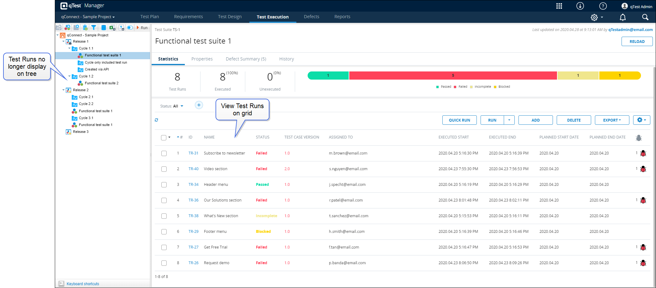 Functions available in the Test Execution tab tree panel have now been added to object grids, including the Test Runs grid, Requirements grid, and Test Cases grid, allowing you to easily access functions that can help you organize your objects.