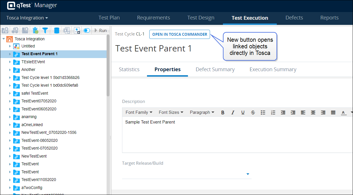 A new button has been added to qTest to allow you to open a linked object in Tosca using the Tosca URL. On a linked Test Case, Test Cycle, or Test Run, you can now click the new Open in Tosca Commander button to navigate to Tosca and view the original object.