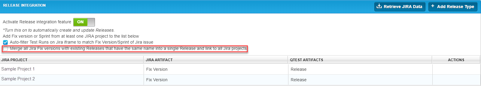 A check box has been added to the Release Integration section:Merge all Jira Fix versions with existing Releases that have the same name into a single Release and link to all Jira projects.