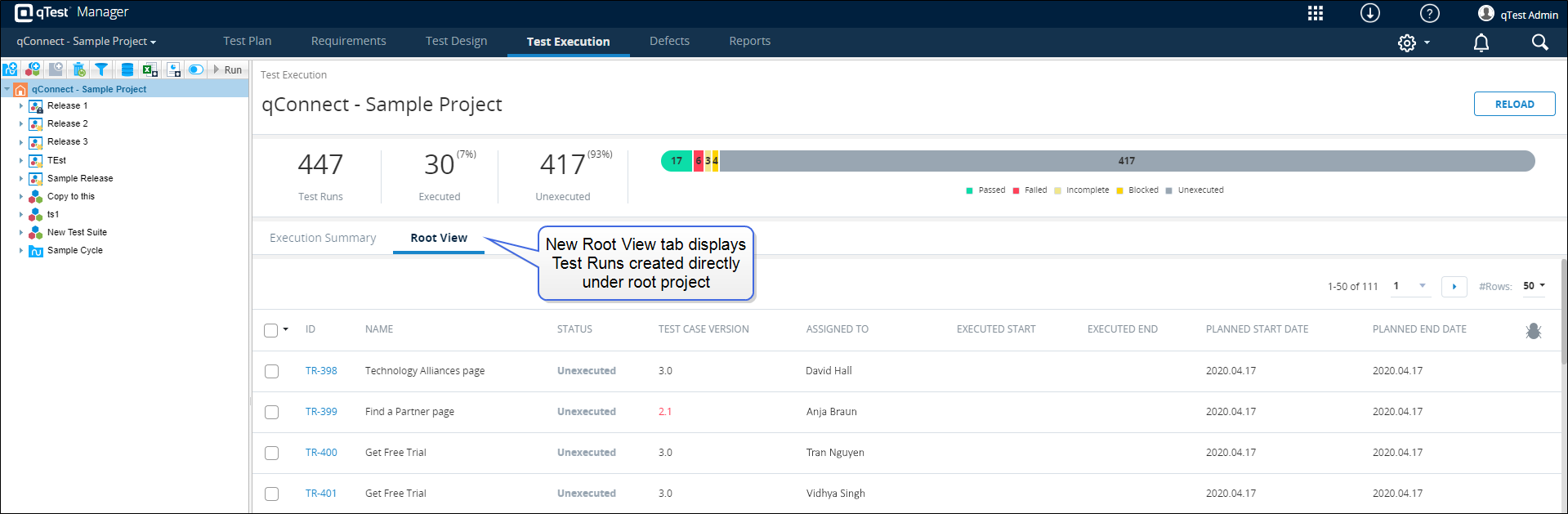 The new Root View tab has been added to the project page on the Test Execution tab. The Root View tab displays the list of existing Test Runs that were created directly under the root project, including details such as the Test Case version, the user that the Test Run is assigned to, and the executed start and end dates. If no Test Runs exist under the root project, the Root View tab will not appear on the Project page.