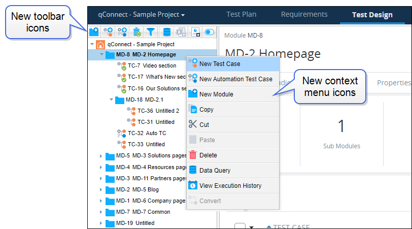 With the addition of Tosca integration to qTest, object icons throughout the qTest UI have been updated to improve design consistency. The new object icons display throughout the qTest UI, including on tab tree panels, dialogs, search results, notifications, object pages, and the Field Settings page.
