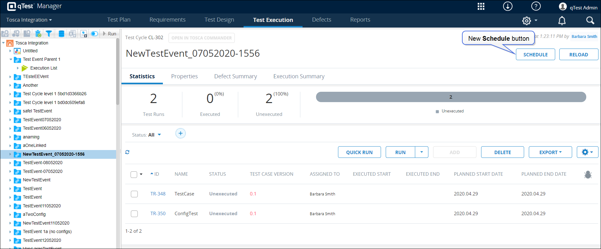 New Schedule button for Test Cycles helps keep Tosca TestEvents up-to-date