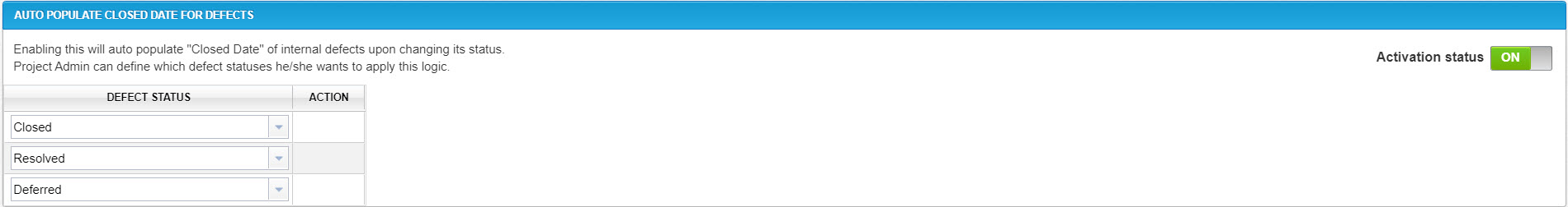 Turn on the Activation status toggle for the Auto Populate Closed Date for Defects section.