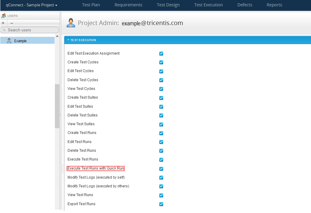 Tricentis has added a new permission for Execute Test Runs with Quick Run. If disabled, Quick Run cannot be used. If enabled, Testers will be able to bypass the required fields set for the Test Run via Quick Run.