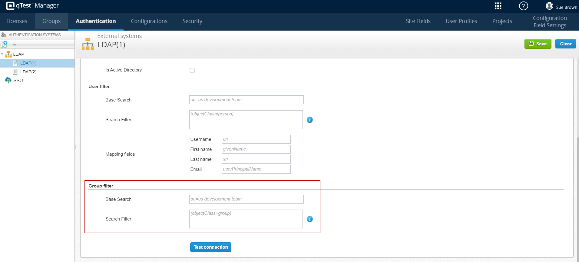 The Group filter section has been added to the External systems screen on the Authentication tab of the Administration area of qTest Manager. This section has been added in preparation for upcoming SSO/LDAP enhancements, which are planned for the next major qTest Manager release. These settings are currently deactivated but will be available in a future release.