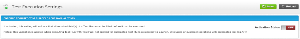 The feature is defaulted to OFF for existing projects and ON for new projects. We recommend Project Admins set this to ON so that testers cannot bypass the required fields of the Test Run when performing this specific workflow.